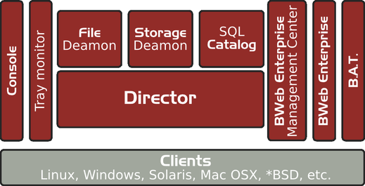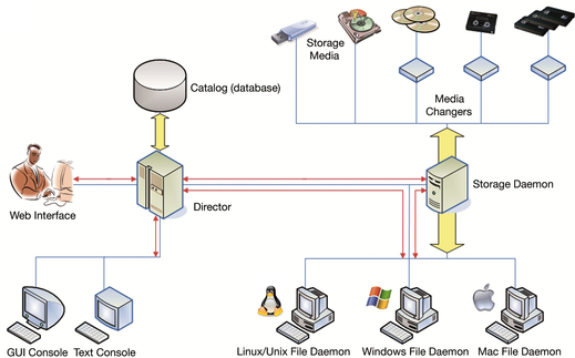 Obr.1 – Obrázek zobrazuje architekturu zálohovacích systémů a je příkladem architektury klient-server. Backup server je znázorněn objektem „Director“, správce zařízení pro zápis objektem „Storage Daemon“ a zálohovací klienti obrázky „tučňáka“, „Windows“ a „Apple“. Web interface, GUI console a znaková konzole ukazují způsob správy systémů zálohování dat. Na „Director“ navazuje katalog s informacemi o zazálohovaných datech a v horní části obrázku jsou znázorněny objekty pro zápis dat (disky, DVD, single páskové mechaniky a páskové knihovny.